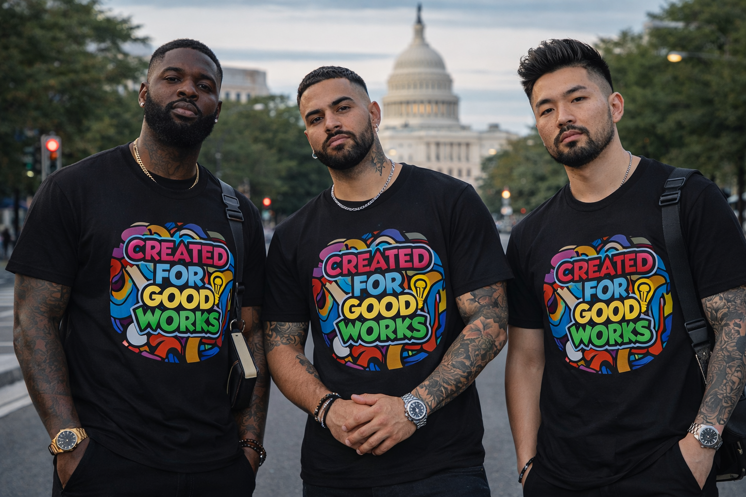 The world's finest sustainable blank tee (logo & labeled). 6 oz. American-Grown SUPIMA® Cotton featuring our vibrant "Created for Good Works" design. 15% of every t-shirt sale funds a hygiene kit paired with engagement for someone in need.